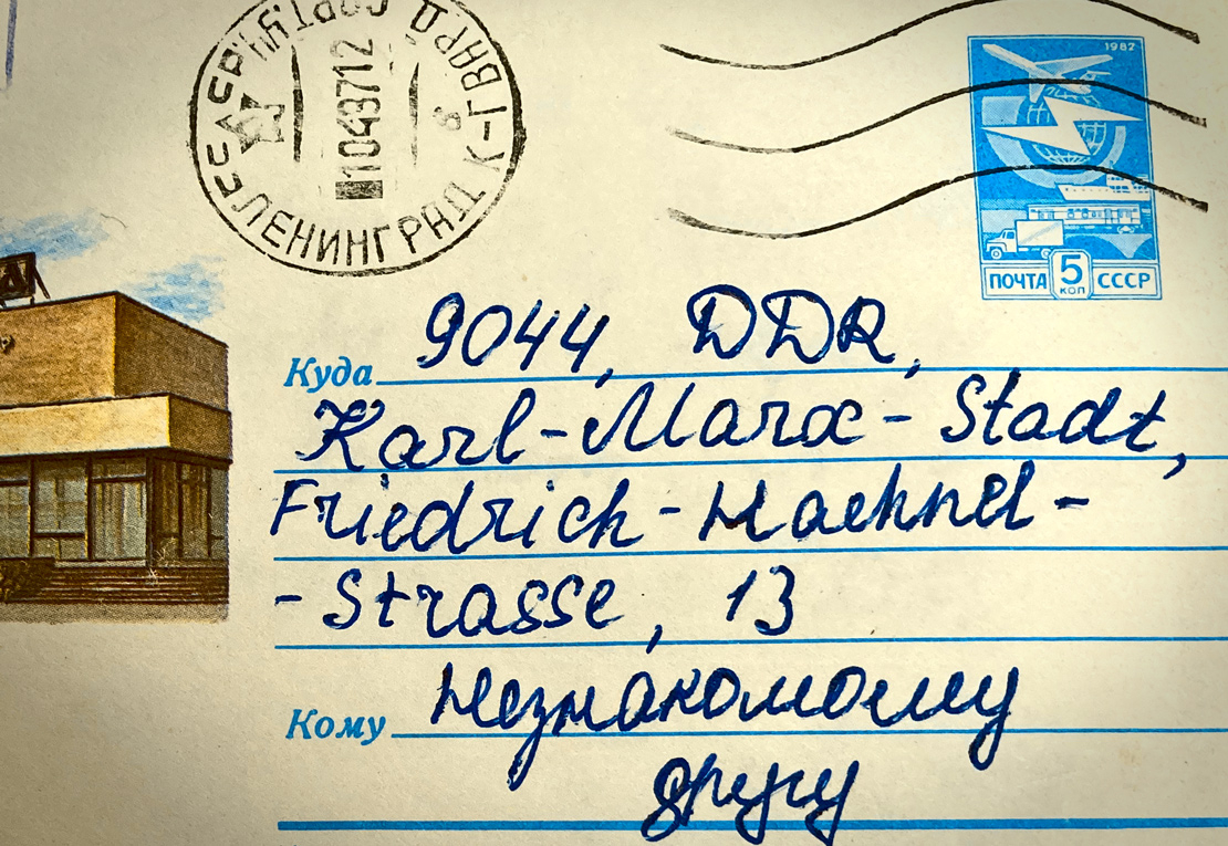 Then, one day, I may have been 11, got a letter. Only my city and street address were written on the envelope. The sender from the Soviet Union, looking for penpals, had gone through a magazine listing addresses of East-German children. She’d picked an address in Karl-Marx-Stadt, maybe because she’d heard of the town in a song that was popular back then with Russians. She figured the person advertising in the magazine would be getting lots of mail already, leaving her without a reply, so she changed the house number. Instead of a name, she wrote "to an unknown friend".